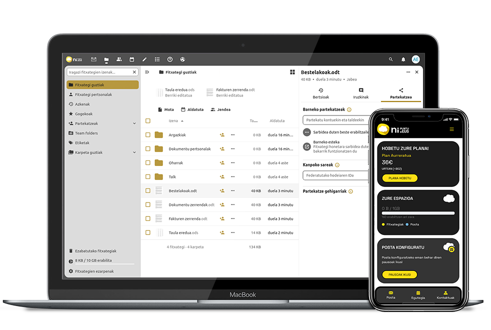 NI.EUS berrituan Nextcloud software librea erabili dugu. Nextcloud partikular eta erakundeentzat pentsatutako hodei-plataforma moderno eta segurua da, fitxategiak gordetzeko, sinkronizatzeko eta partekatzeko ez ezik, talde-lankidetza osoa leku bakar batean eskaintzen duena: dokumentuen edizio kolaboratiboa, egutegiak, kontaktuak, txata eta bideo-deiak barne.