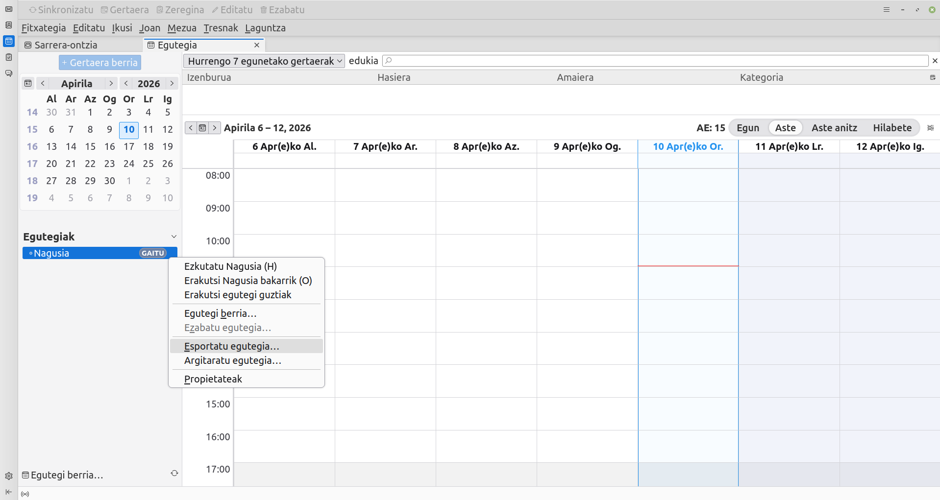 Thunderbird-eko ‘Egutegia’ atalera zuzenduko gara, eta migratu nahi dugun egutegira zuzenduko gara. Eskuinera dauden hiru puntuak aukeratuko ditugu, eta ‘Esportatu egutegia’ klikatuko dugu.