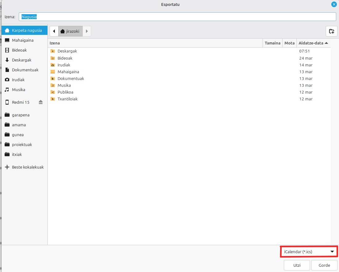 Esportatzerako garaian, ongi aukeratu ICS formatua.