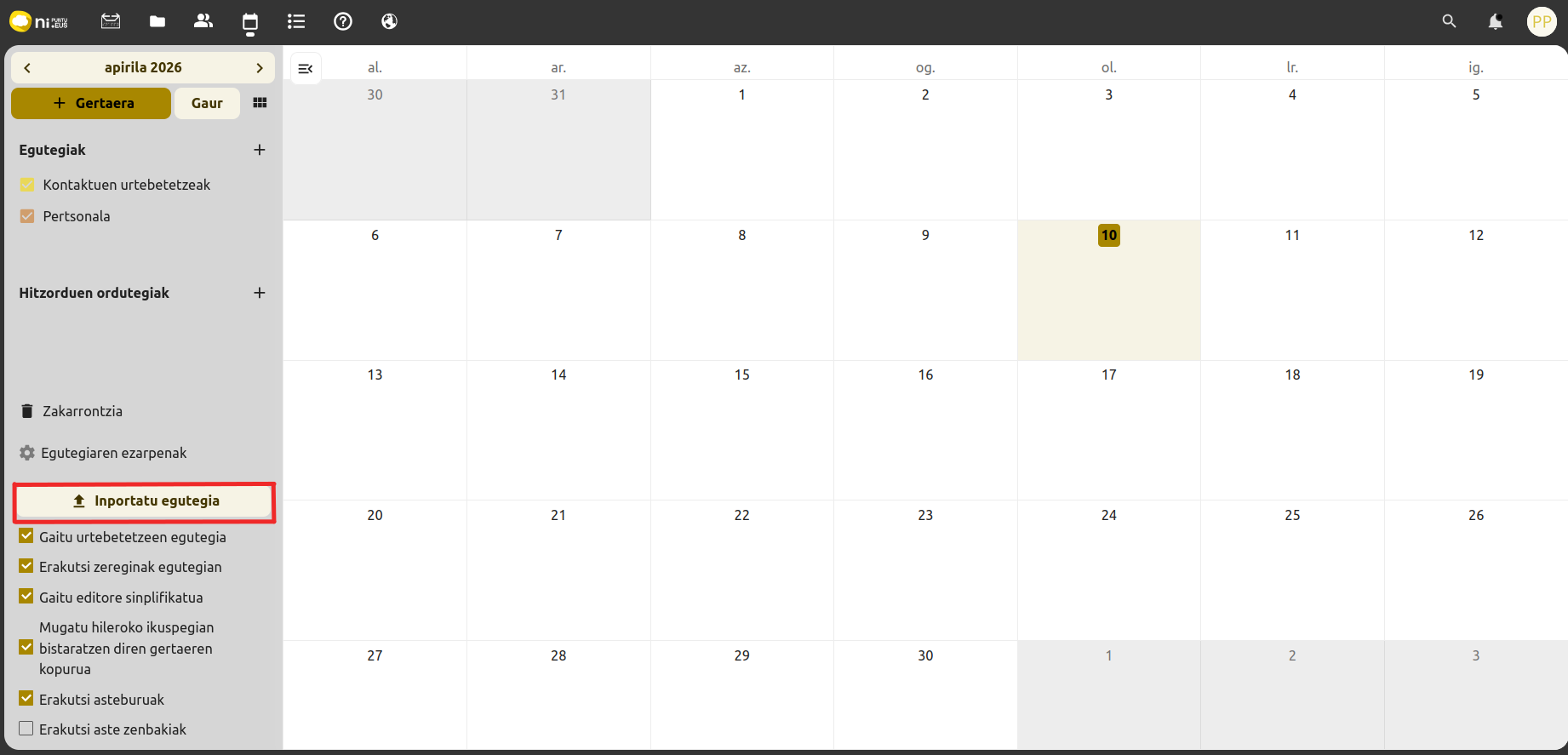 Ondoren, ni.eus-eko ‘Egutegia’ atalera zuzenduko gara, eta azpiko ‘Egutegiaren ezarpenak’ irekita, ‘Inportatu egutegia’ klikatuko dugu. Esportatu berri dugun ICS fitxategia aukeratuko dugu.